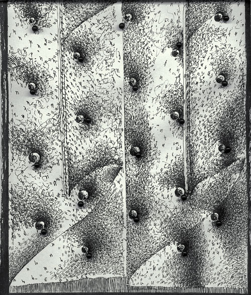 Une boule de plus. Distincte, elle s’incruste à la suite des autres dans un dispositif complexe, oublié dès l’achèvement de la page. Toujours différente, la forme lourde et lisse, rugueuse et légère, baroque ou minimaliste offre, journellement, sa permanente rondeur noire au blanc du papier.